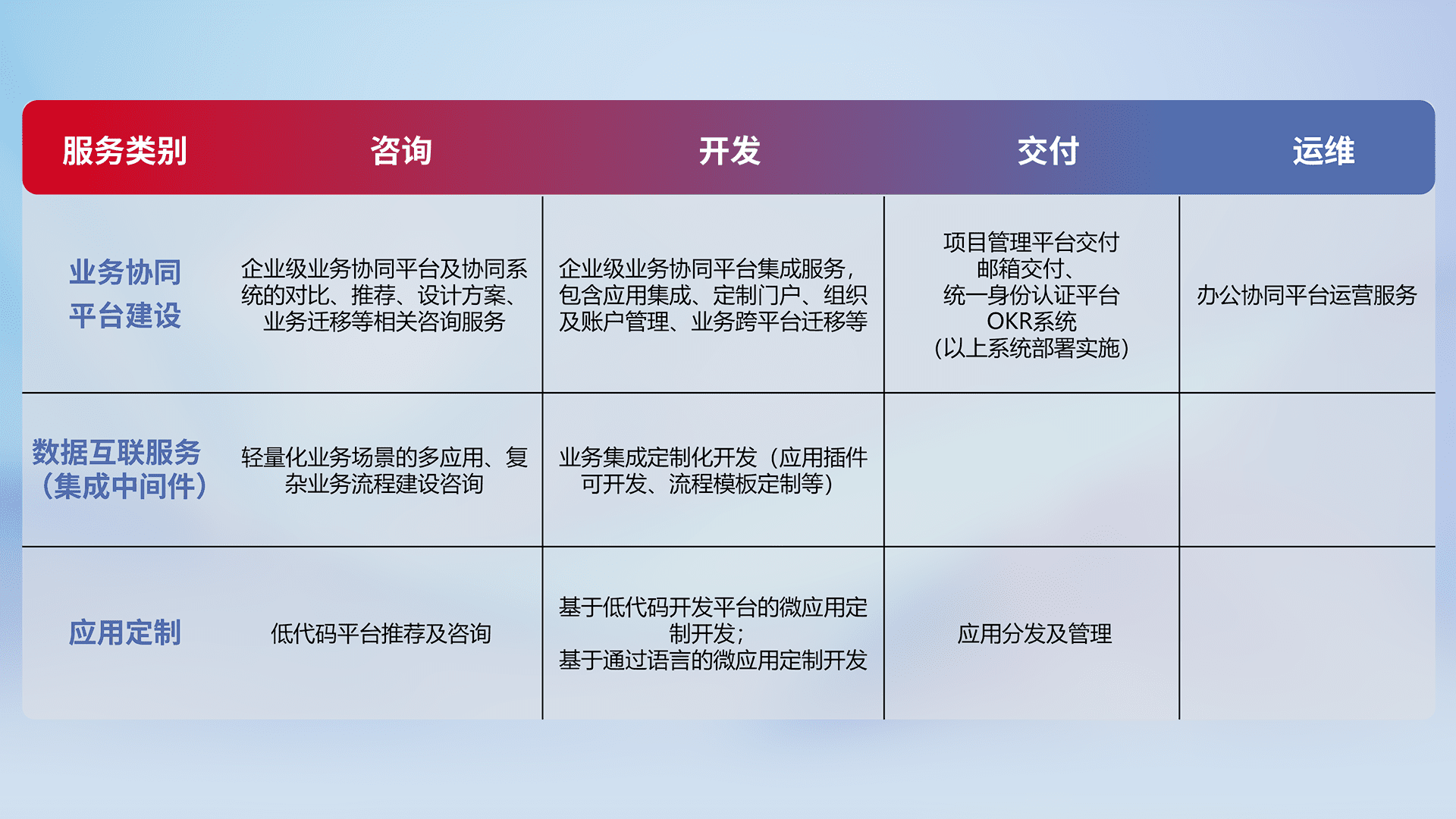 针对钉钉、、企微、、、、IDaas等平台级产品提供产品的规划、、、方案、、、交付、、、定制化开发等服务,,,,实现如统一协同办公、、智能客户服务、、混合会议管理、、、、智能数据查询、、、等业务场景,,实现数字化转型。。。。